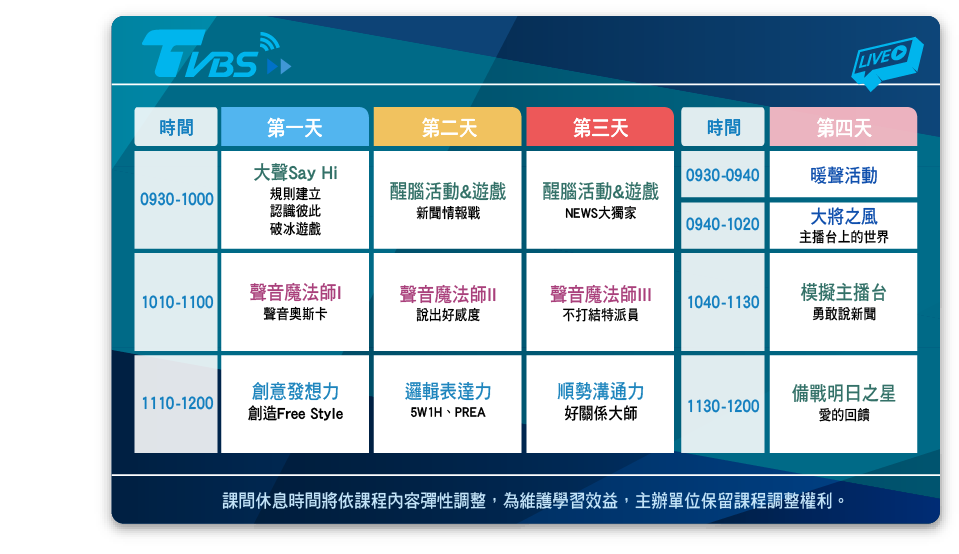 TVBS自信表達線上主播營 課程表: